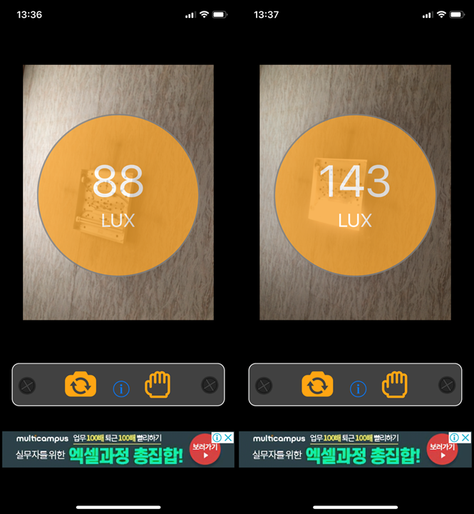 형광등이 2개라고 가정을 하였을때에도 2배 가까이의 밝기 차이를 확인 할 수 있습니다.