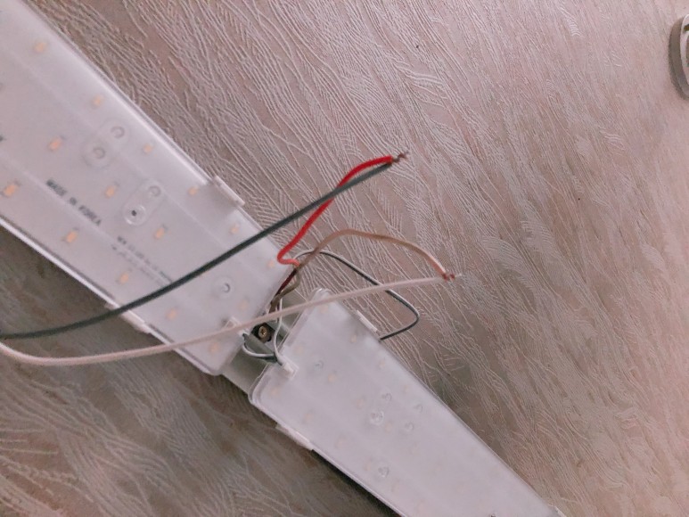주방등에서 사용하던 전선연결단자 같은 것은 없었기 때문에, 그냥 서로 전선을 붙여주고, 절연테이브(검정테이브)로 감아 마무리 지어주었구요!!! 마지막으로 튀어나온 선은 위로 올려서 스카치 테이브로 간단하게 고정시켜주어 작업을 마무리 했습니다!!!