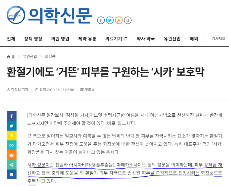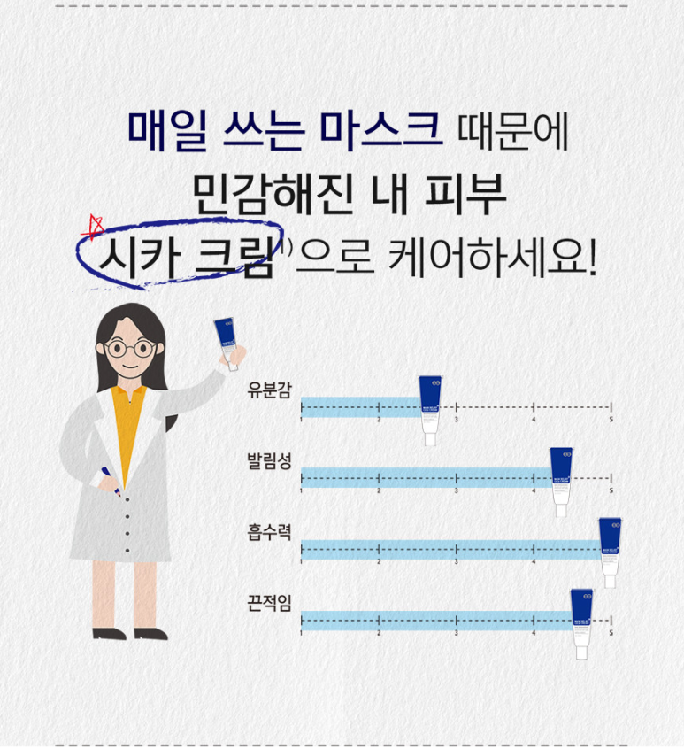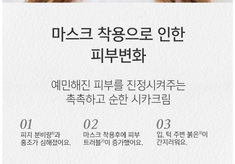 "시카 성분이란 센텔라 아시아티카(병풀추출물), 마데카소사이드 등의 성분을 의미하는데, 피부 상처를 개선하고 장벽 강화에 도움을 줘 환절기 외부 자극으로 손상된 피부를 즉각적으로 진정시키는 화장품으로 주목"