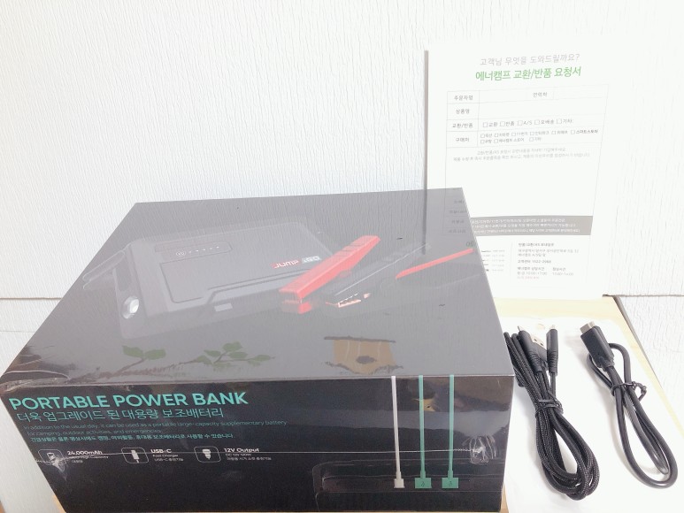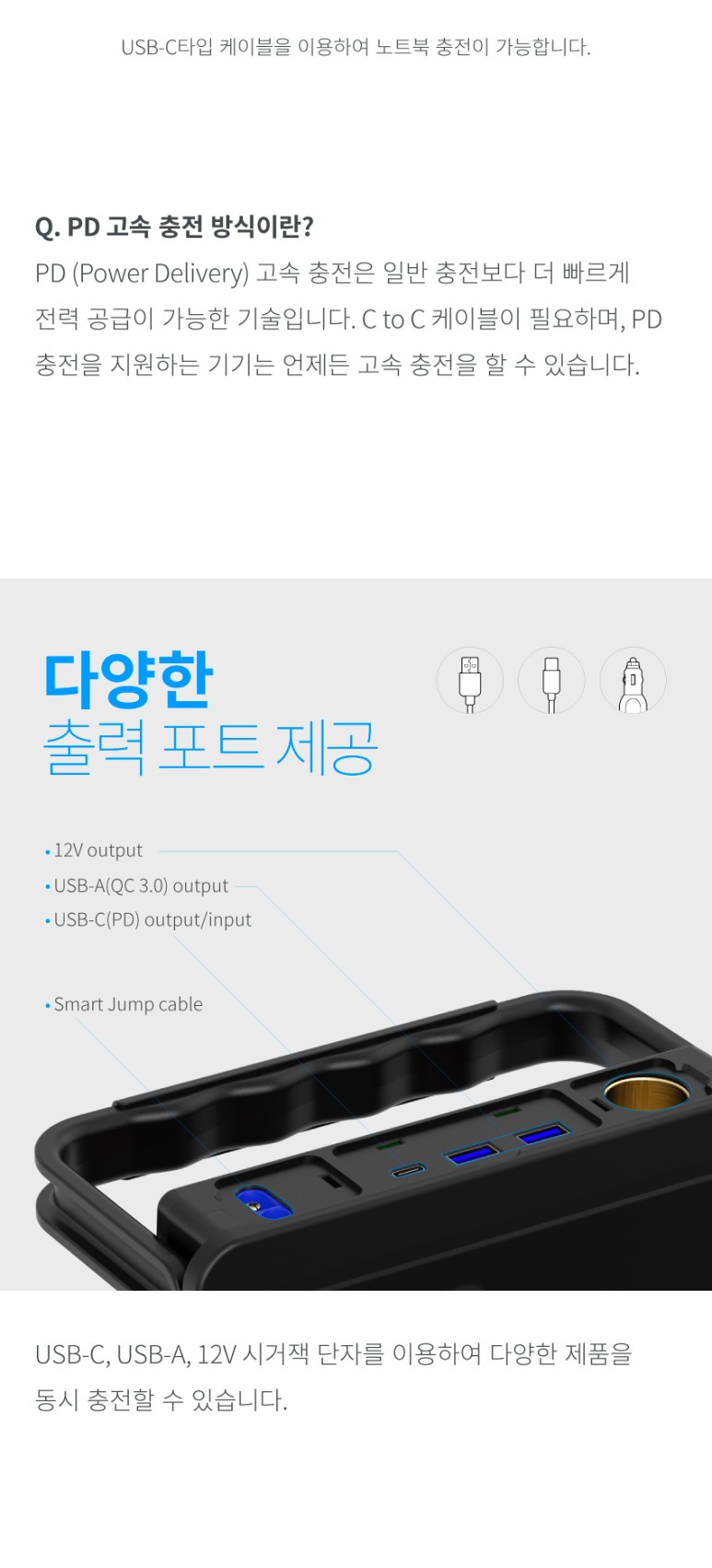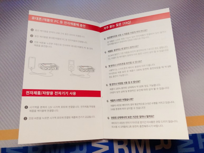 제품 풀 충전 시 "아이폰 X" 기준 8회 충전 가능하다고 하며, 차량 시동은 50번이나 걸 수 있다고 한다.
