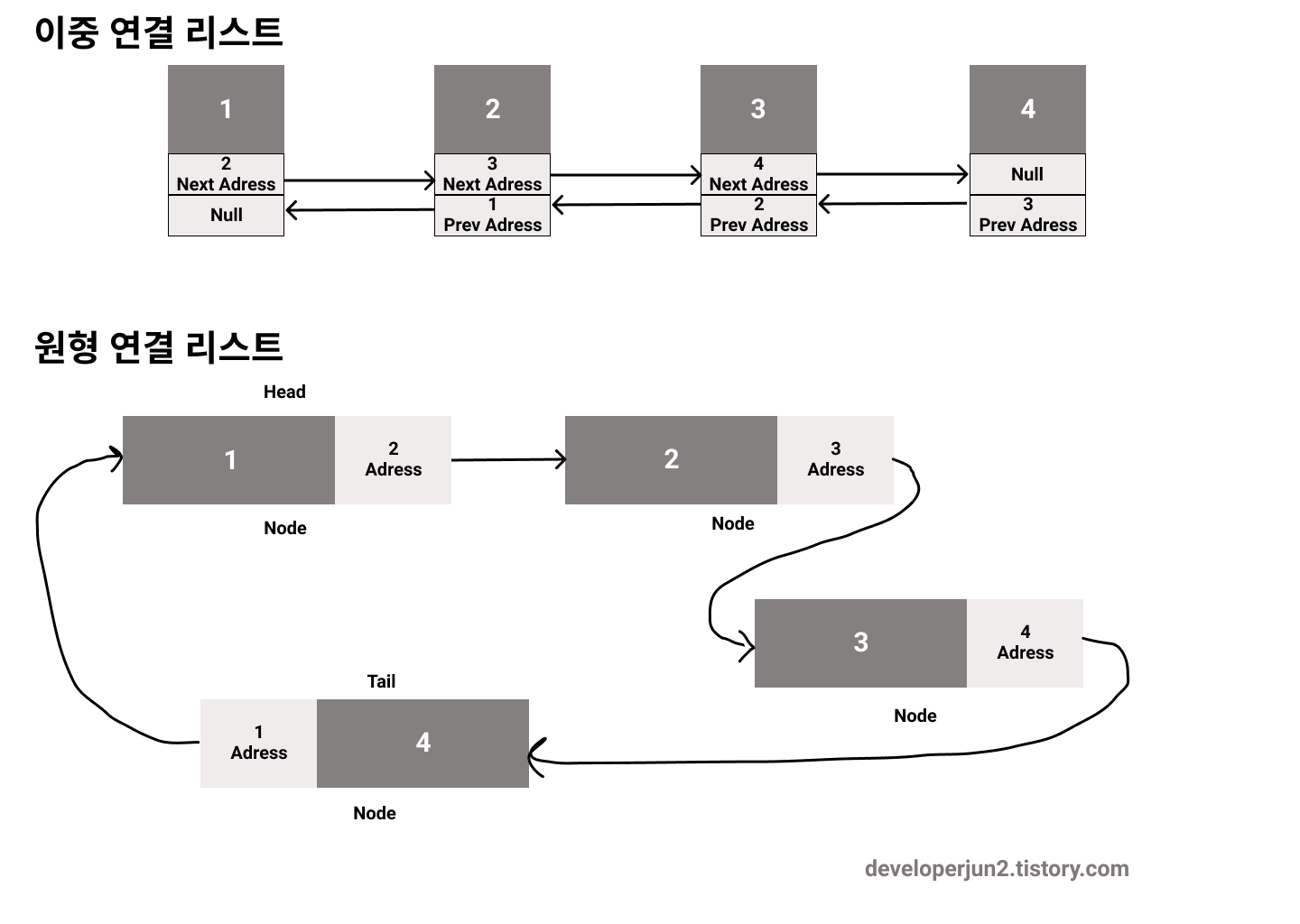 다음, 이전 2개의 주소 값을 가진 형태의