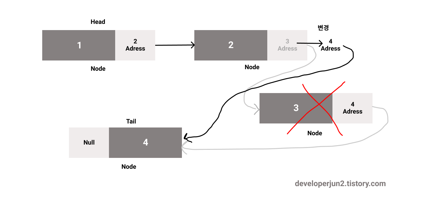 if(no === 0) this.#head = current.nextNode; // 첫 번째 데이터 삭제 시, 다음 노드를 헤드 위치로 변경