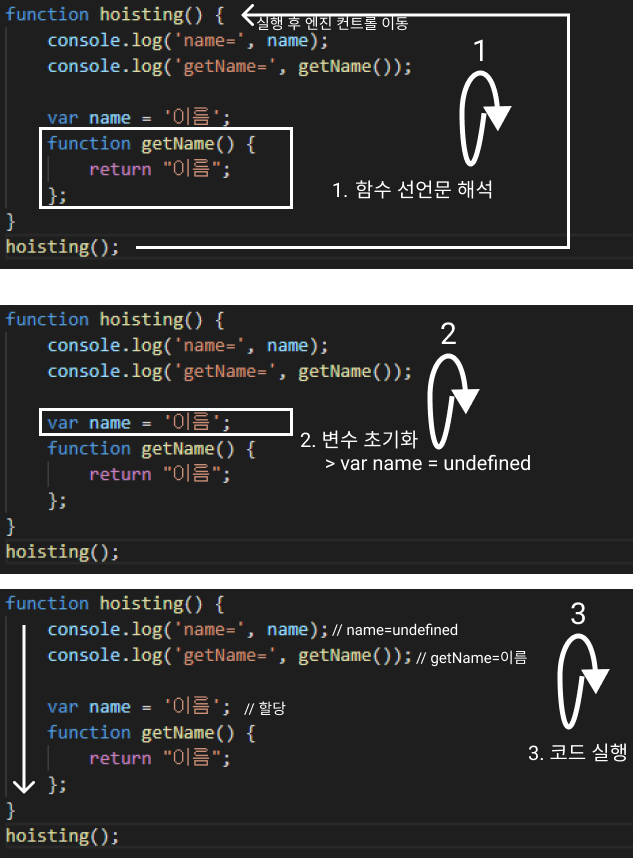 - 함수는 실행되기 전에 함수 안에 필요한 변수값들을 모두 모아서 유효 범위의 최상단에 선언