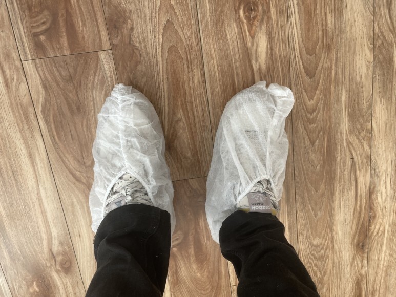 신발 위에 덧신을 신고
