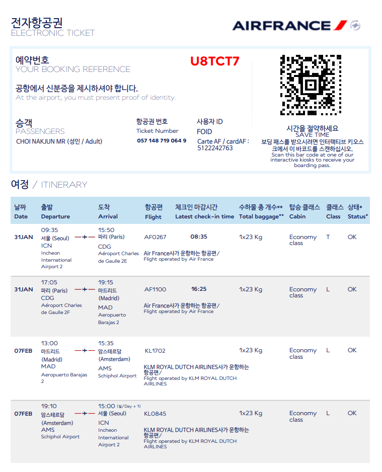 출국 - 09시 35분 서울 출발 ~ 19시 15분 마드리드 도착 (약 18시간 소요)