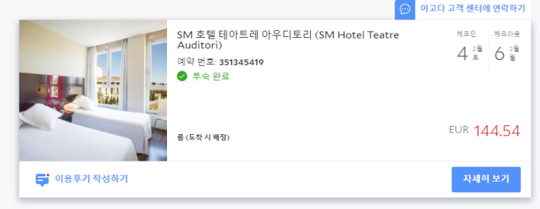 숙소는 평균 10만 원으로 잡았으며, 예약은 전날에 한 경우도 있었다. 개인적으로는 세비야 호텔이 기억에 날 만큼 정말 좋고 깨끗했다. 그다음으로는 마지막 날 마드리드에서의 호텔 리젠트 그다음은 첫날 마드리드 비티움 그리고 마지막으로 바르셀로나에서의 SM 호텔 순으로 좋았다. 방은 모두 거기서 거기 비슷했지만 청결함이 다르고, 특히 SM 호텔은 방음도 잘 안되고 공기가 안 좋은 느낌이 확 들었다. (반지하 같은 느낌..)