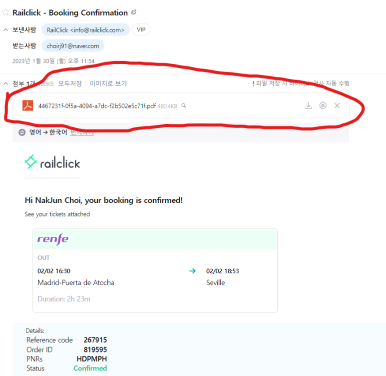 간략한 예매 정보와 함께 pdf로 된 첨부파일이 있는데,