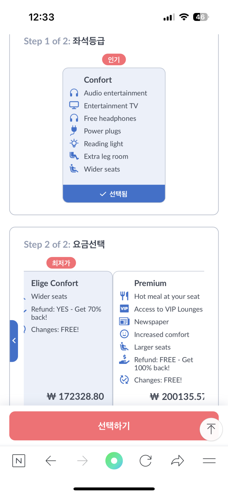 좌석에 대한 등급 및 옵션을 선택할 수 있다.