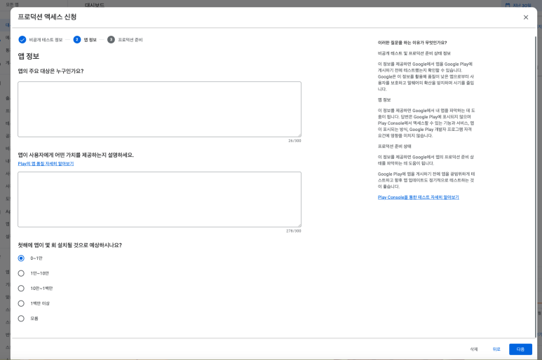신청 버튼을 누르니 테스터를 어떻게 모았는지, 어려웠는지에 대한 설문조사 같은 느낌의 질문이 있었습니다.
