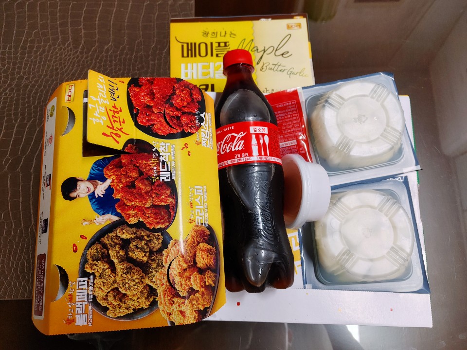 메이플버터갈릭 6조각, 황금올리브 반 마리, 콜라 500ml, 치킨무 2개, 찐킹 소스(원통), 양념소스 (팩)