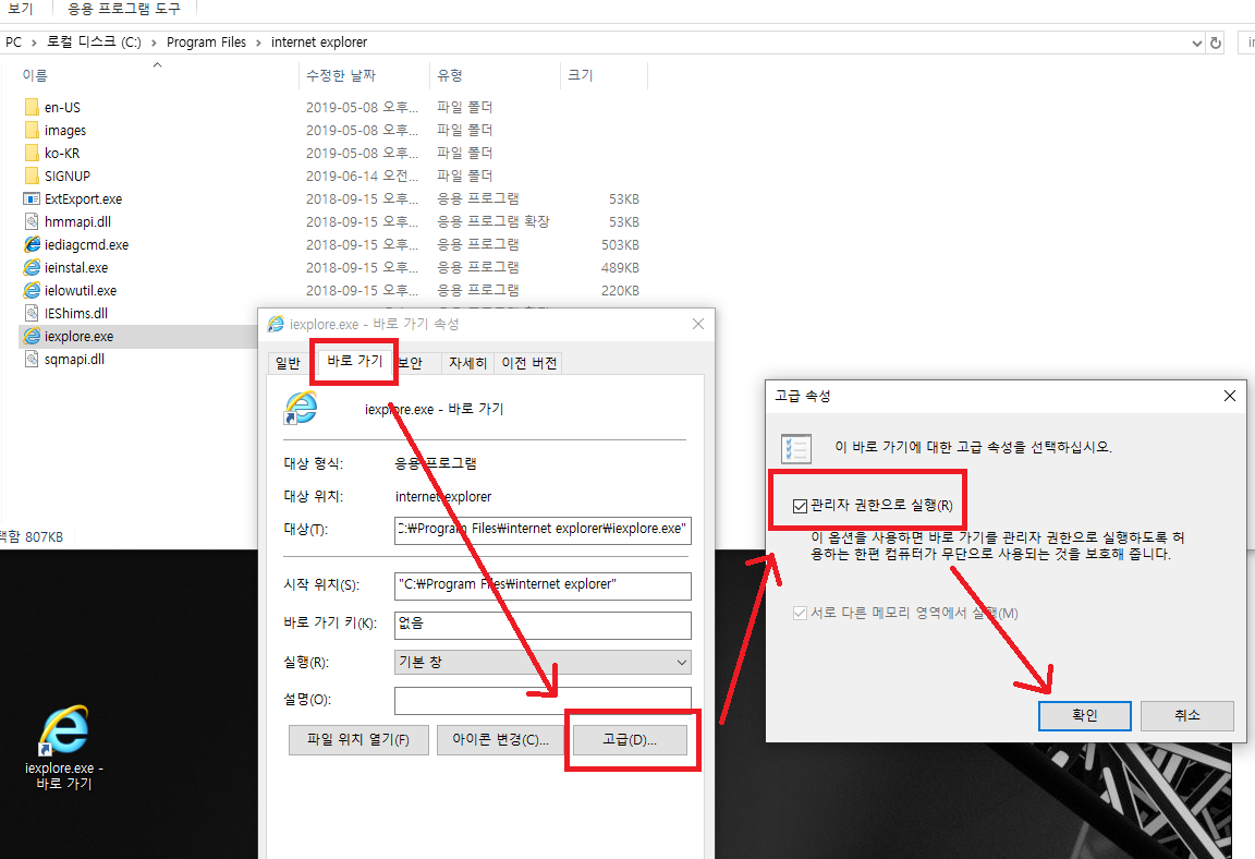 2. 진짜 위치에 있던 익스플로러 파일을 바탕화면으로 끌어다 놉니다.