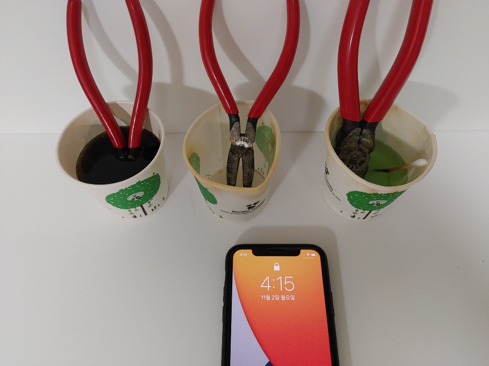 녹이 쓴 공구를 각각 종이컵에 넣어 주었습니다.