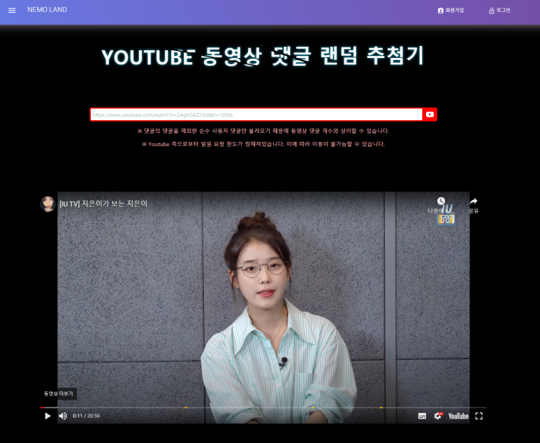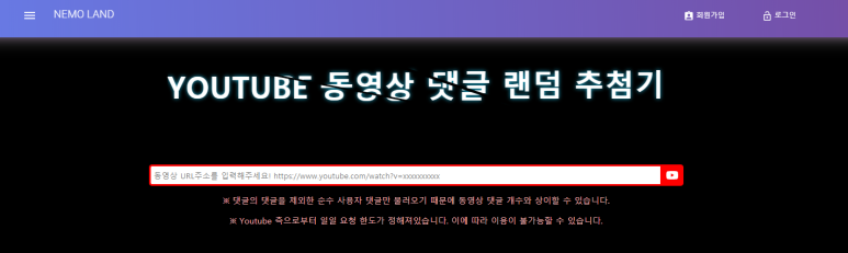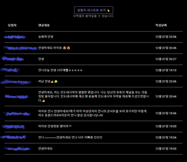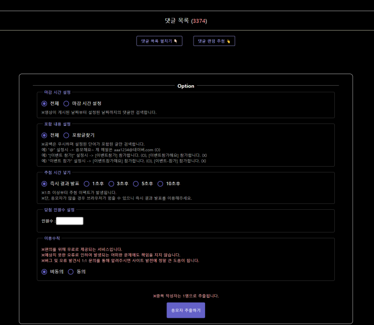 영상의 게시 일부 터 설정 시간까지의 댓글만 추첨할 수 있는 것 같다.