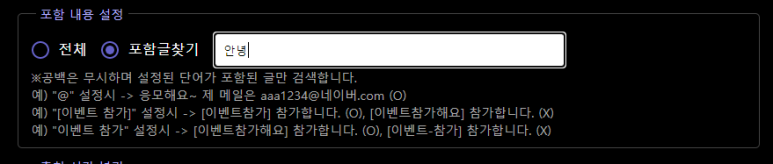 예로, "[이벤트신청]" 을 설정하면 해당 글자가 들어간 댓글만 골라준다.