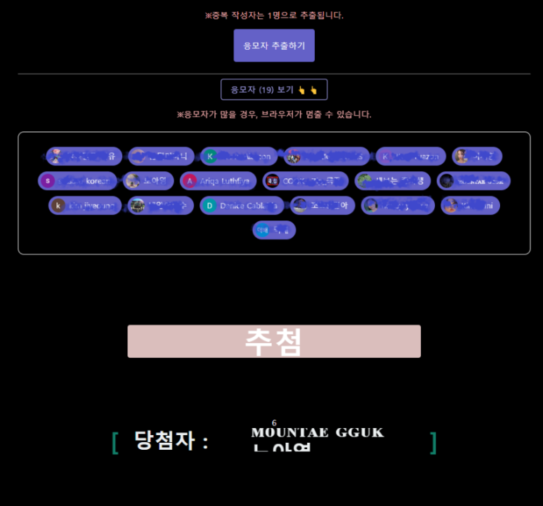 두 번째로 '댓글 랜덤 추첨' 버튼을 눌러보면,