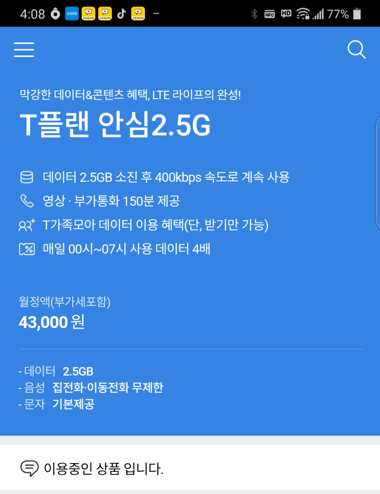 진짜 저렴한 요금제 T 플랜 안심 2.5G를 사용 중인데,