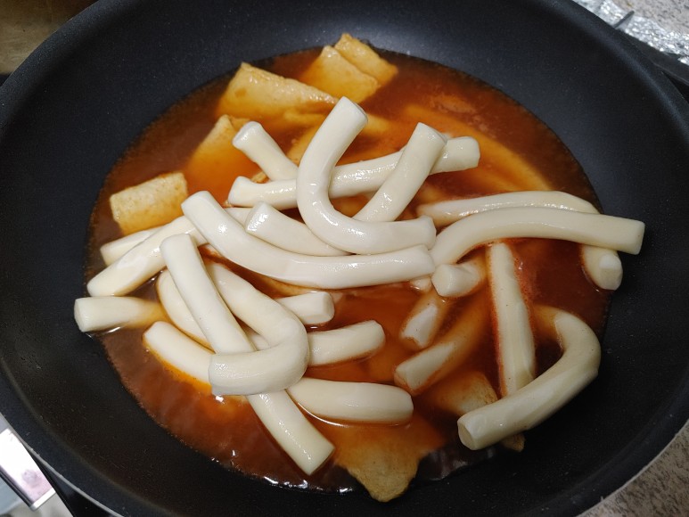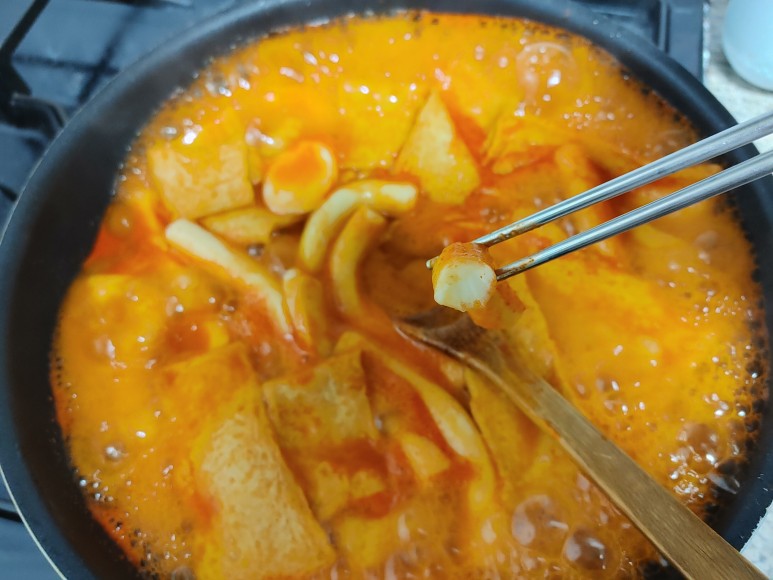 팔팔팔 끓이고 있을 때 떡을 한 입 먹어보았습니다.