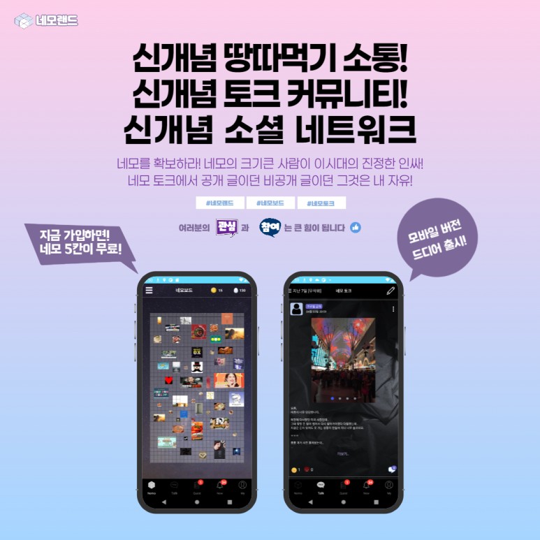 신개념 땅따먹기 소통 커뮤니티 네모보드! 메인화면 네모보드에서 네모를 확보하고 소통해보세요. 네모를 많이 확보할수록 크기도 커집니다. 나의 콘텐츠를 주목시켜보세요. 나의 글을 모두가