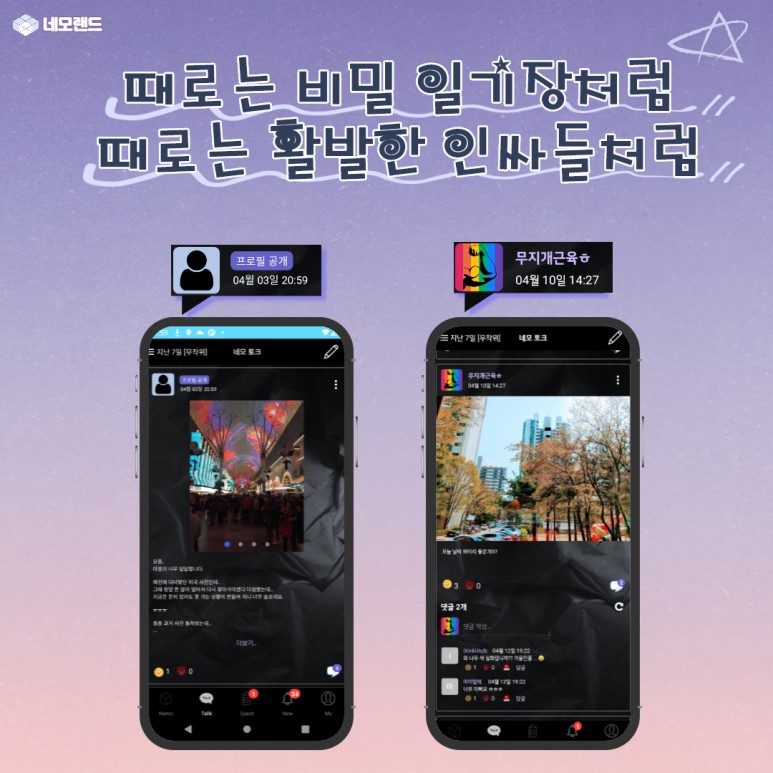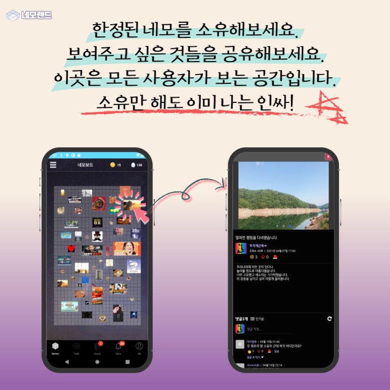 이 네모랜드 앱은 기존 SNS과 전혀 다른 방식을 채택했다.