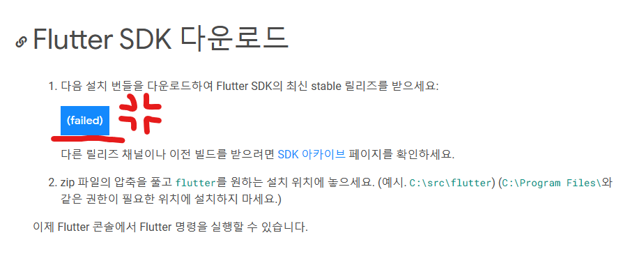 플러터 failed 오류 해결! flutter failed ! sdk 다운로드 failed 오류 해결!