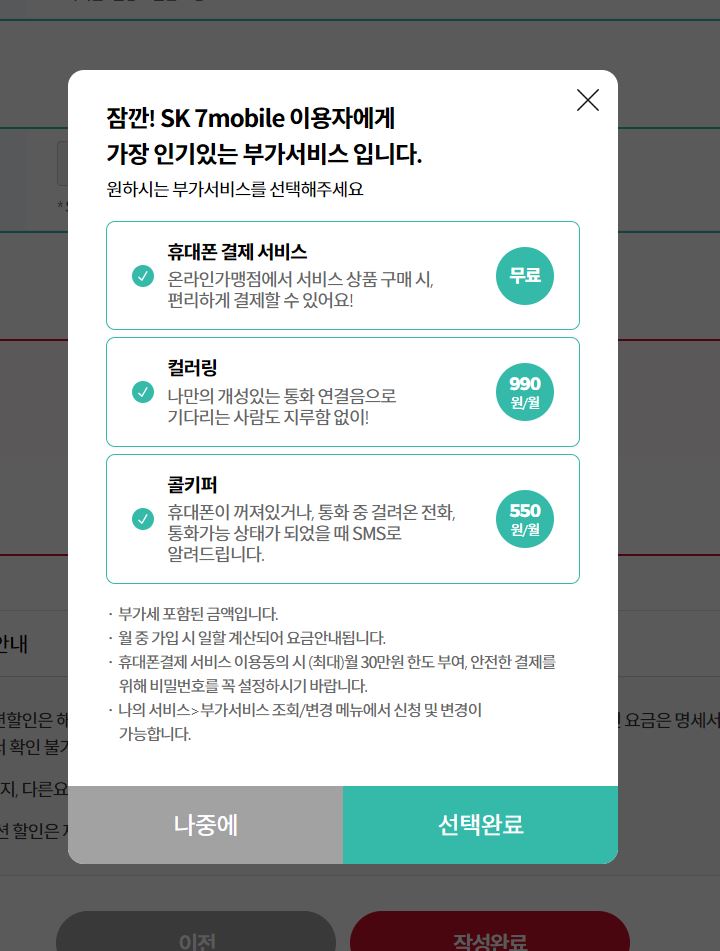 인기있는 부가서비스 가입창이 뜨는데,