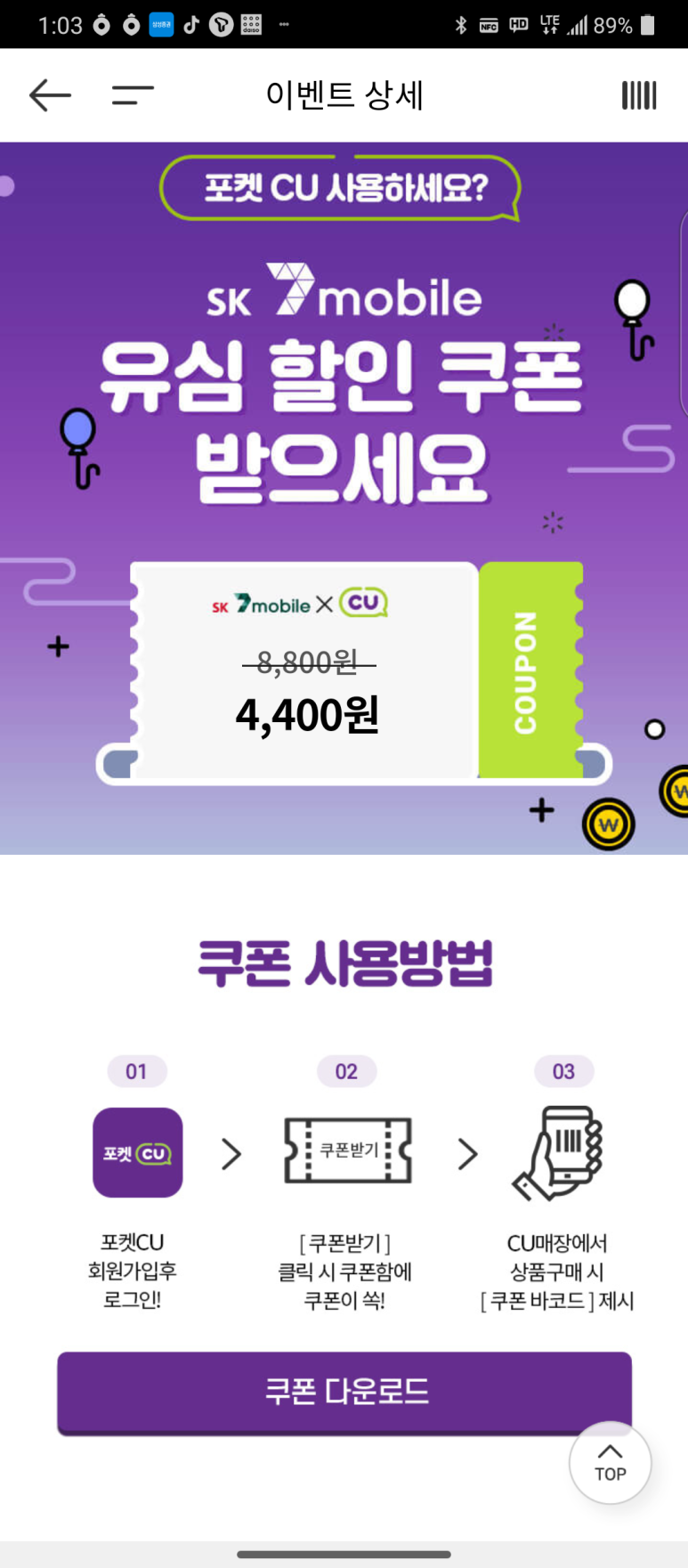 일단 cu 유심을 할인 받기 위해 어플을 다운 받았다.